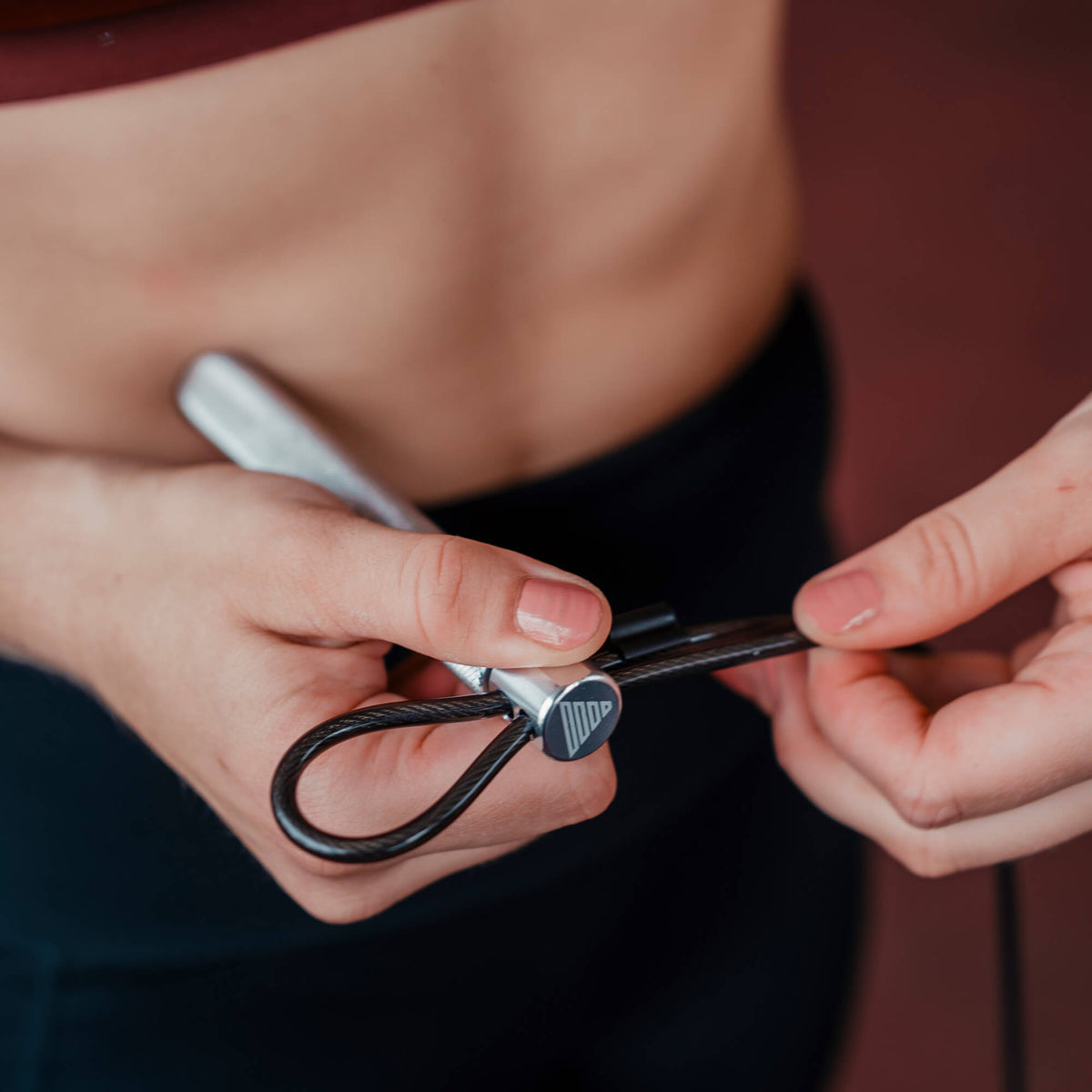 ● Die richtige Länge deines Seils einstellen: Für die richtige Länge einfach mittig auf das Seil stellen. Die Griffe sollten jetzt auf Brusthöhe eingestellt werden bzw. die Achseln erreichen. Jetzt öffnest du die Schlaufe, stellst das Seil auf die richtige Länge ein und ziehst es fest ● Wenn du möchtest, kannst du das überschüssige Seil mit einer Zange abkneifen, damit du ohne Ablenkung springen kannst