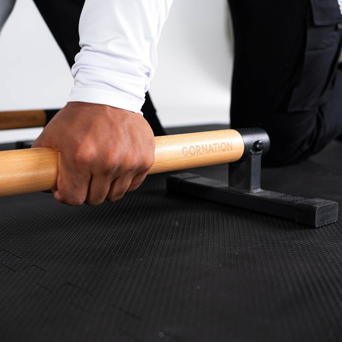 Les poignées en bois de hêtre offrent une prise agréable et absorbent l'humidité, essentielle pour garantir la sécurité pendant les exercices. Pesant seulement 3,2 kg, les Parallettes sont légères et compactes, idéales pour s'entraîner à la maison, à la salle ou en extérieur.